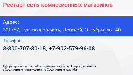 Рестарт, сеть комиссионных магазинов по адресу 301767, Тульская область, Донской, Октябрьская, 40 в дальнейшем Организация, размещена в следующих категориях: