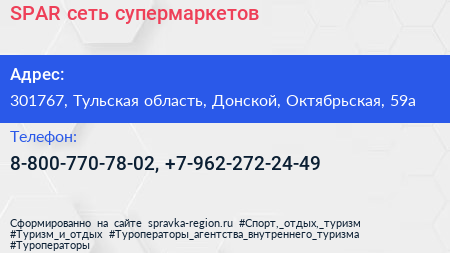 SPAR, сеть супермаркетов по адресу 301767, Тульская область, Донской, Октябрьская, 59а в дальнейшем Организация, размещена в следующих категориях: