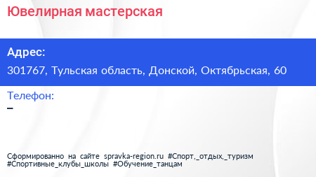 Ювелирная мастерская по адресу 301767, Тульская область, Донской, Октябрьская, 60 в дальнейшем Организация, размещена в следующих категориях: