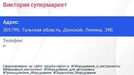 Виктория, супермаркет по адресу 301790, Тульская область, Донской, Ленина, 39Б в дальнейшем Организация, размещена в следующих категориях: