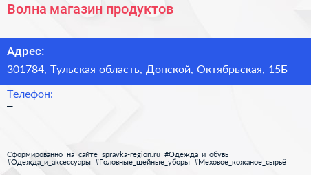 Волна, магазин продуктов по адресу 301784, Тульская область, Донской, Октябрьская, 15Б в дальнейшем Организация, размещена в следующих категориях: