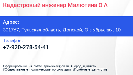 Кадастровый инженер Малютина О.А. по адресу 301767, Тульская область, Донской, Октябрьская, 10 в дальнейшем Организация, размещена в следующих категориях: