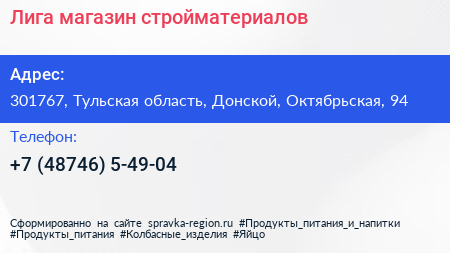 Лига, магазин стройматериалов по адресу 301767, Тульская область, Донской, Октябрьская, 94 в дальнейшем Организация, размещена в следующих категориях: