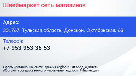 Швеймаркет, сеть магазинов по адресу 301767, Тульская область, Донской, Октябрьская, 63 в дальнейшем Организация, размещена в следующих категориях: