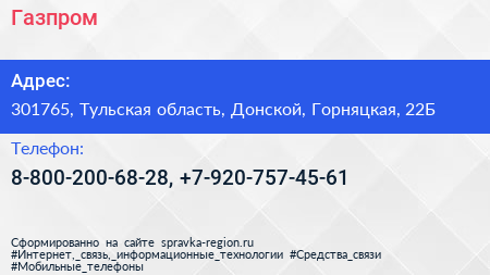 Газпром по адресу 301765, Тульская область, Донской, Горняцкая, 22Б в дальнейшем Организация, размещена в следующих категориях: