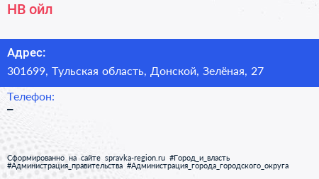 НВ-ойл по адресу 301699, Тульская область, Донской, Зелёная, 27 в дальнейшем Организация, размещена в следующих категориях: