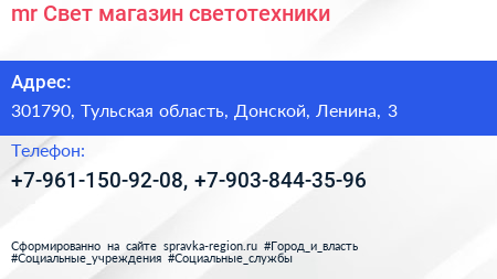 mr.Свет, магазин светотехники по адресу 301790, Тульская область, Донской, Ленина, 3 в дальнейшем Организация, размещена в следующих категориях: