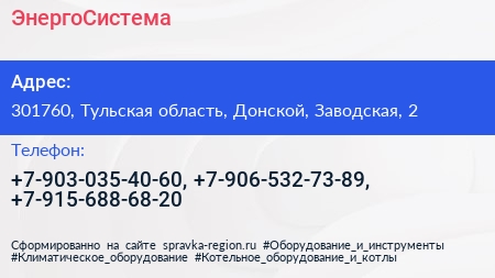 ЭнергоСистема по адресу 301760, Тульская область, Донской, Заводская, 2 в дальнейшем Организация, размещена в следующих категориях: