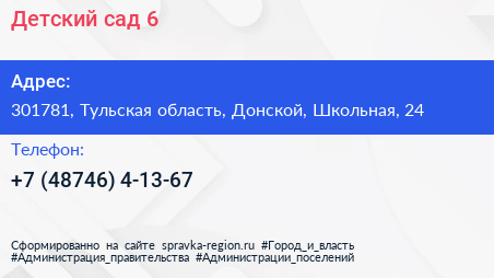 Детский сад №6 по адресу 301781, Тульская область, Донской, Школьная, 24 в дальнейшем Организация, размещена в следующих категориях: