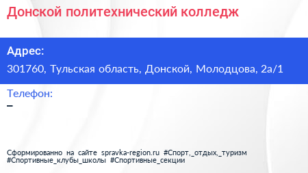 Донской политехнический колледж по адресу 301760, Тульская область, Донской, Молодцова, 2а/1 в дальнейшем Организация, размещена в следующих категориях: