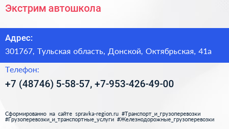 Экстрим, автошкола по адресу 301767, Тульская область, Донской, Октябрьская, 41а в дальнейшем Организация, размещена в следующих категориях: