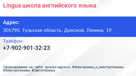 Lingua, школа английского языка по адресу 301790, Тульская область, Донской, Ленина, 19 в дальнейшем Организация, размещена в следующих категориях: