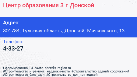 Центр образования №3, г. Донской по адресу 301784, Тульская область, Донской, Маяковского, 13 в дальнейшем Организация, размещена в следующих категориях: