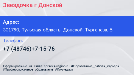 Звездочка, г. Донской по адресу 301790, Тульская область, Донской, Тургенева, 5 в дальнейшем Организация, размещена в следующих категориях: