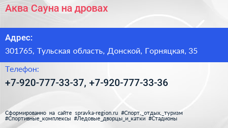 Аква-Сауна на дровах по адресу 301765, Тульская область, Донской, Горняцкая, 35 в дальнейшем Организация, размещена в следующих категориях: