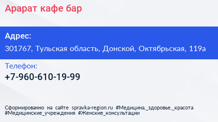Арарат, кафе-бар по адресу 301767, Тульская область, Донской, Октябрьская, 119а в дальнейшем Организация, размещена в следующих категориях:
