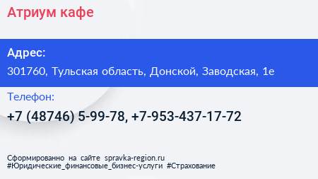 Атриум, кафе по адресу 301760, Тульская область, Донской, Заводская, 1е в дальнейшем Организация, размещена в следующих категориях: