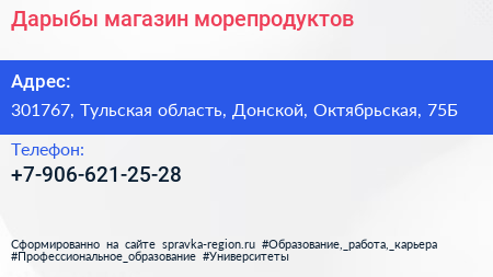 Дарыбы, магазин морепродуктов по адресу 301767, Тульская область, Донской, Октябрьская, 75Б в дальнейшем Организация, размещена в следующих категориях:
