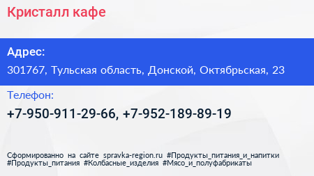 Кристалл, кафе по адресу 301767, Тульская область, Донской, Октябрьская, 23 в дальнейшем Организация, размещена в следующих категориях: