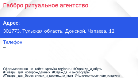 Габбро, ритуальное агентство по адресу 301773, Тульская область, Донской, Чапаева, 12 в дальнейшем Организация, размещена в следующих категориях: