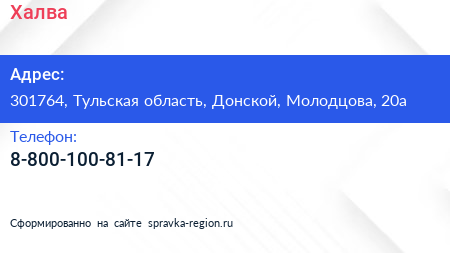 Халва по адресу 301764, Тульская область, Донской, Молодцова, 20а в дальнейшем Организация, размещена в следующих категориях: