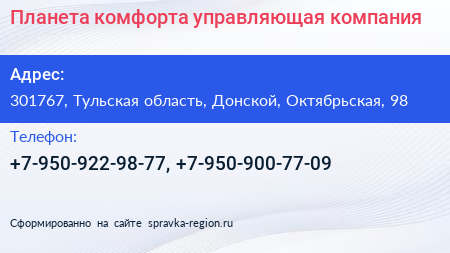 Планета комфорта, управляющая компания по адресу 301767, Тульская область, Донской, Октябрьская, 98 в дальнейшем Организация, размещена в следующих категориях: