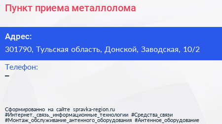 Пункт приема металлолома по адресу 301790, Тульская область, Донской, Заводская, 10/2 в дальнейшем Организация, размещена в следующих категориях: