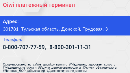 Qiwi, платежный терминал по адресу 301781, Тульская область, Донской, Трудовая, 3 в дальнейшем Организация, размещена в следующих категориях: