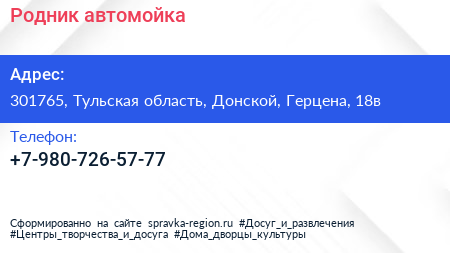 Родник, автомойка по адресу 301765, Тульская область, Донской, Герцена, 18в в дальнейшем Организация, размещена в следующих категориях:
