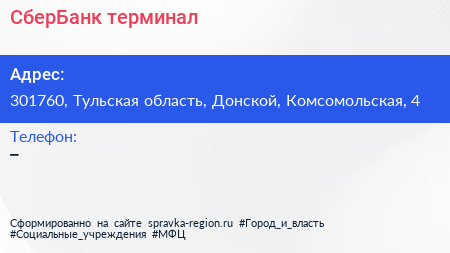 СберБанк, терминал по адресу 301760, Тульская область, Донской, Комсомольская, 4 в дальнейшем Организация, размещена в следующих категориях: