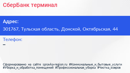 СберБанк, терминал по адресу 301767, Тульская область, Донской, Октябрьская, 44 в дальнейшем Организация, размещена в следующих категориях: