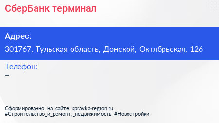 СберБанк, терминал по адресу 301767, Тульская область, Донской, Октябрьская, 126 в дальнейшем Организация, размещена в следующих категориях: