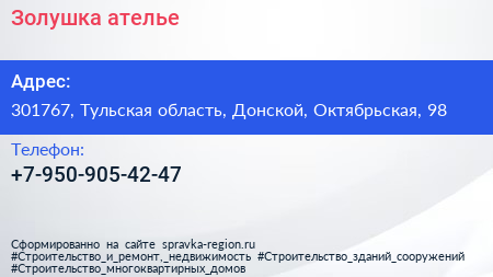 Золушка, ателье по адресу 301767, Тульская область, Донской, Октябрьская, 98 в дальнейшем Организация, размещена в следующих категориях: