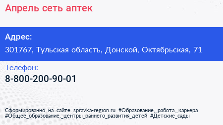 Апрель, сеть аптек по адресу 301767, Тульская область, Донской, Октябрьская, 71 в дальнейшем Организация, размещена в следующих категориях:
