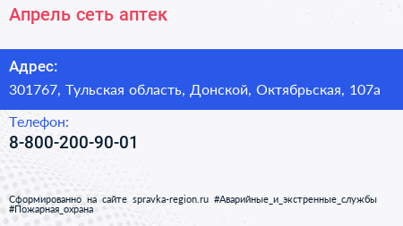 Апрель, сеть аптек по адресу 301767, Тульская область, Донской, Октябрьская, 107а в дальнейшем Организация, размещена в следующих категориях: