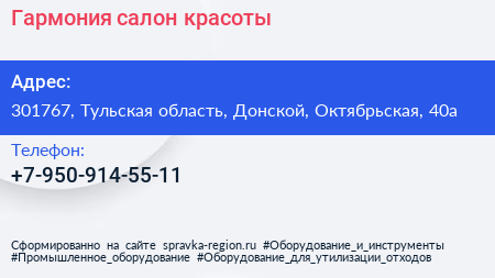 Гармония, салон красоты по адресу 301767, Тульская область, Донской, Октябрьская, 40а в дальнейшем Организация, размещена в следующих категориях: