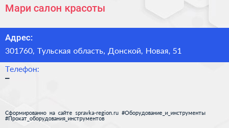 Мари, салон красоты по адресу 301760, Тульская область, Донской, Новая, 51 в дальнейшем Организация, размещена в следующих категориях: