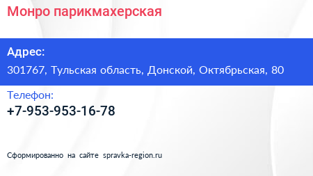 Монро, парикмахерская по адресу 301767, Тульская область, Донской, Октябрьская, 80 в дальнейшем Организация, размещена в следующих категориях: