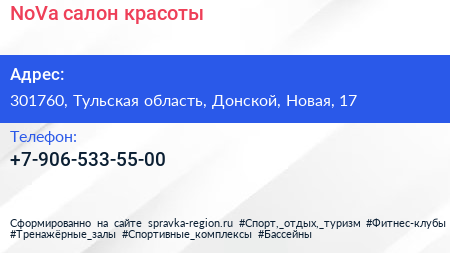 NoVa, салон красоты по адресу 301760, Тульская область, Донской, Новая, 17 в дальнейшем Организация, размещена в следующих категориях: