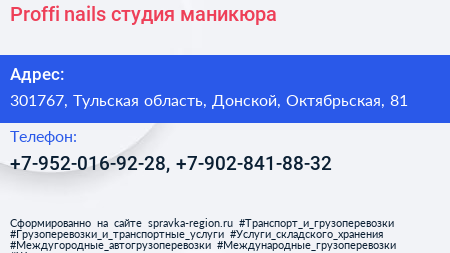 Proffi nails, студия маникюра по адресу 301767, Тульская область, Донской, Октябрьская, 81 в дальнейшем Организация, размещена в следующих категориях:
