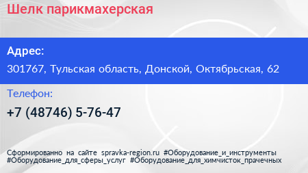 Шелк, парикмахерская по адресу 301767, Тульская область, Донской, Октябрьская, 62 в дальнейшем Организация, размещена в следующих категориях:
