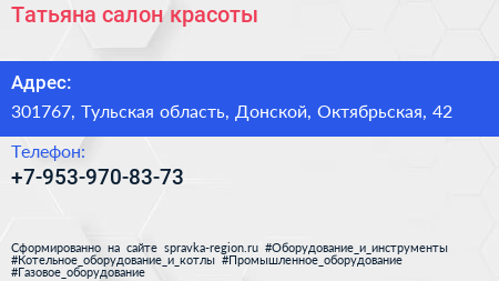 Татьяна, салон красоты по адресу 301767, Тульская область, Донской, Октябрьская, 42 в дальнейшем Организация, размещена в следующих категориях: