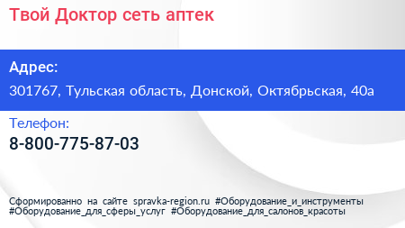 Твой Доктор, сеть аптек по адресу 301767, Тульская область, Донской, Октябрьская, 40а в дальнейшем Организация, размещена в следующих категориях: