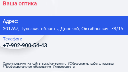 Ваша оптика по адресу 301767, Тульская область, Донской, Октябрьская, 78/15 в дальнейшем Организация, размещена в следующих категориях: