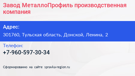 Завод МеталлоПрофиль, производственная компания по адресу 301760, Тульская область, Донской, Ленина, 2 в дальнейшем Организация, размещена в следующих категориях: