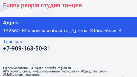 Funny people, студия танцев по адресу 142660, Московская область, Дрезна, Юбилейная, 4 в дальнейшем Организация, размещена в следующих категориях: