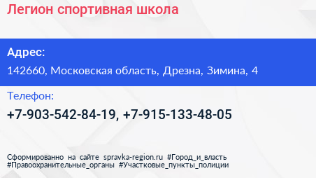Легион, спортивная школа по адресу 142660, Московская область, Дрезна, Зимина, 4 в дальнейшем Организация, размещена в следующих категориях: