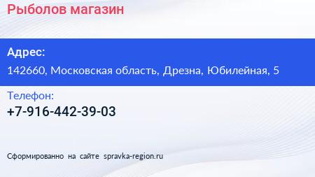 Рыболов, магазин по адресу 142660, Московская область, Дрезна, Юбилейная, 5 в дальнейшем Организация, размещена в следующих категориях: