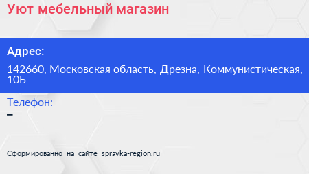 Уют, мебельный магазин по адресу 142660, Московская область, Дрезна, Коммунистическая, 10Б в дальнейшем Организация, размещена в следующих категориях: