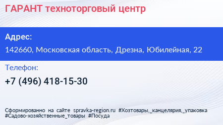 ГАРАНТ, техноторговый центр по адресу 142660, Московская область, Дрезна, Юбилейная, 22 в дальнейшем Организация, размещена в следующих категориях: